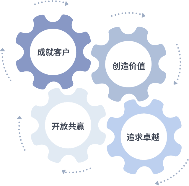 成就客户是一切决策的出发点,,创造价值是衡量所有工作的标准,,,,追求卓越是我们做事做人的态度,,,,开放共赢是我们的格局也是最终的结果。。价值观的齿轮环环相扣,,,,推动着组织里的每个人不断向前。。。。
